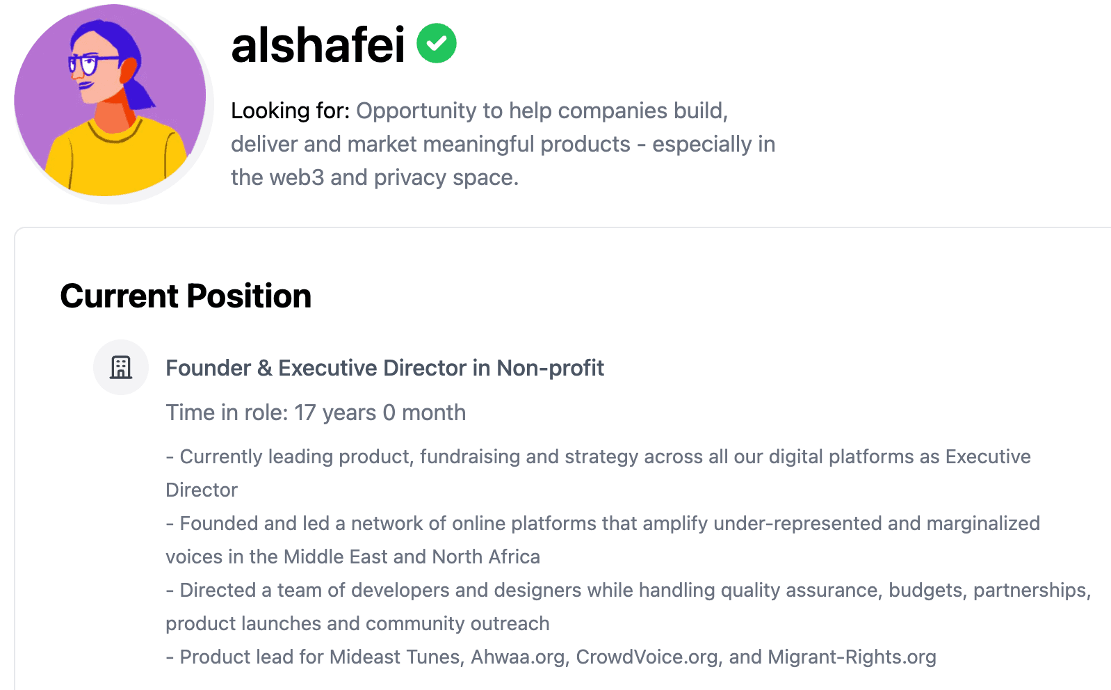 Next, Geo’s profile is another excellent instance of putting Noxx profiles to work. Geo has in-depth descriptions of their experiences, and a clear call-to-action for employers on what they're looking for as a job. Geo is a highly experienced Product Manager with an impressive track record of working with a variety of companies in sectors such as crypto, decentralized prediction markets, and wearable tech.