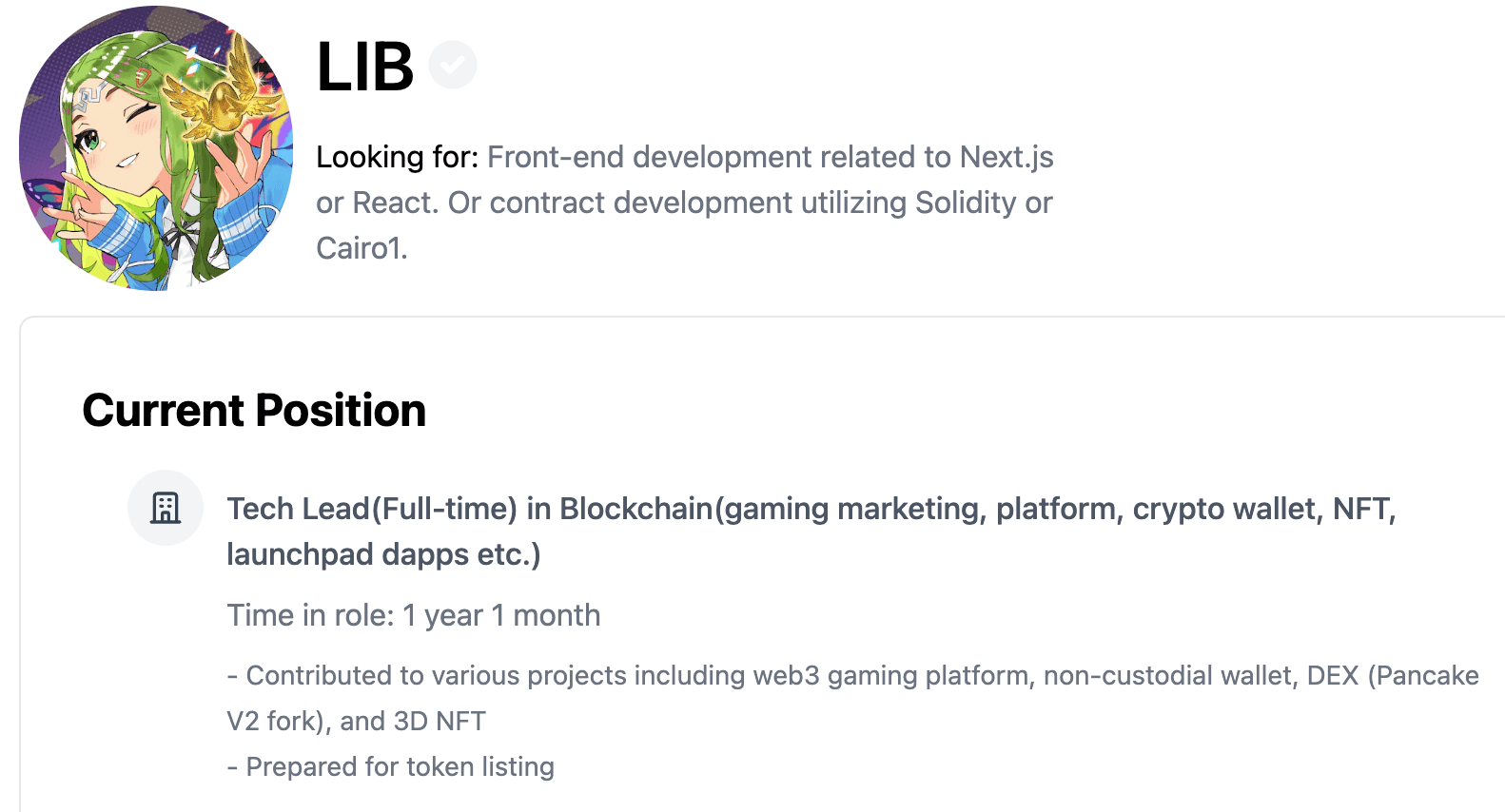 LIB is a skilled tech lead and engineer with proficiency in crypto, specializing in front-end development utilizing Next.js and React, and contract development using Solidity. With over a year of experience, LIB has contributed to a diverse range of projects including web3 gaming platforms, non-custodial wallets, decentralized exchanges, and NFTs, and has prepared for token listings. Additionally, as an engineer in education, LIB played a key role in driving sales growth from $100k/month to $2M over six years.