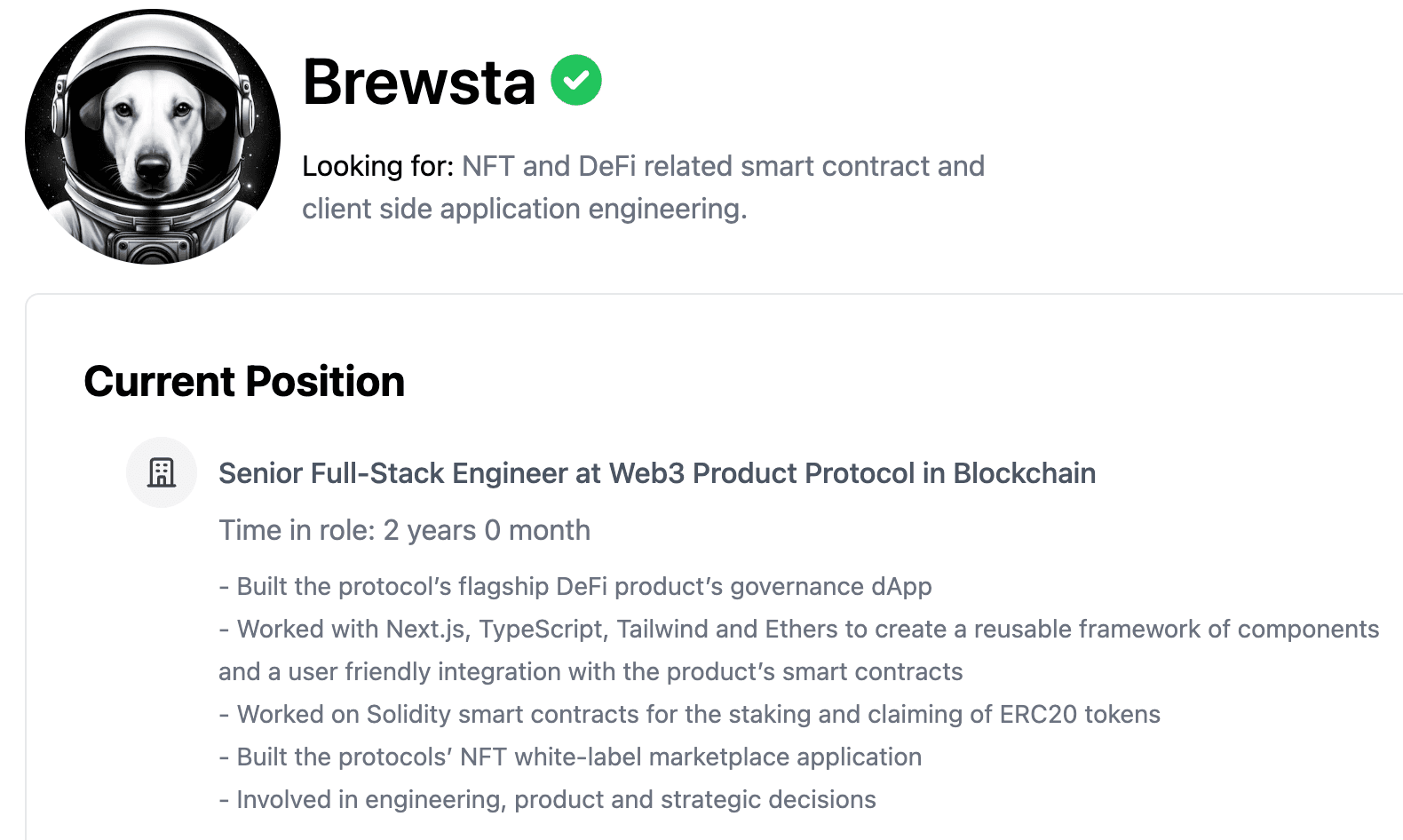Brewsta’s profile is a great example of what’s possible with Noxx. Their current position is descriptive, complete with accomplishments and time in the role. Brewsta is a seasoned engineer with a focus on NFT and DeFi-related smart contract and client-side applications. With over 12 years of web development experience, Brewsta made a seamless transition into crypto, where they notably developed and optimized ERC721 smart contracts, built dApps, contributed to DAOs, and played a crucial role in strategic product decisions.