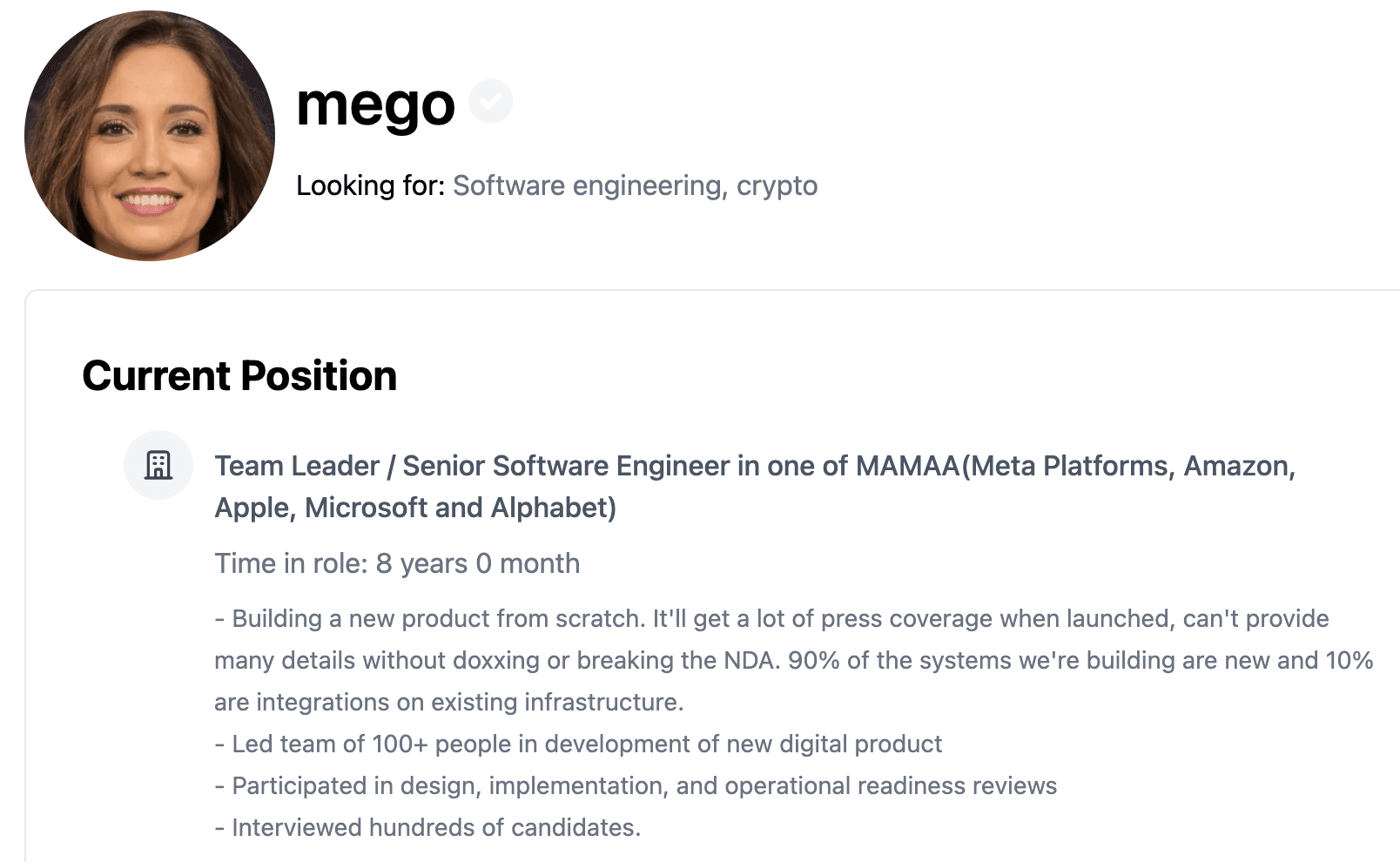 Mego is a Senior Software Engineer and Team Leader with significant experience at a top tech company included in the MAMAA group (Meta, Amazon, Apple, Microsoft, and Alphabet). She has led a 100+ person team in the development of a new digital product, providing leadership in design, implementation, and operational readiness reviews, and has also played a significant role in the recruitment process, interviewing hundreds of candidates. Notably, Mego is currently building a product from scratch that promises high press coverage upon launch.